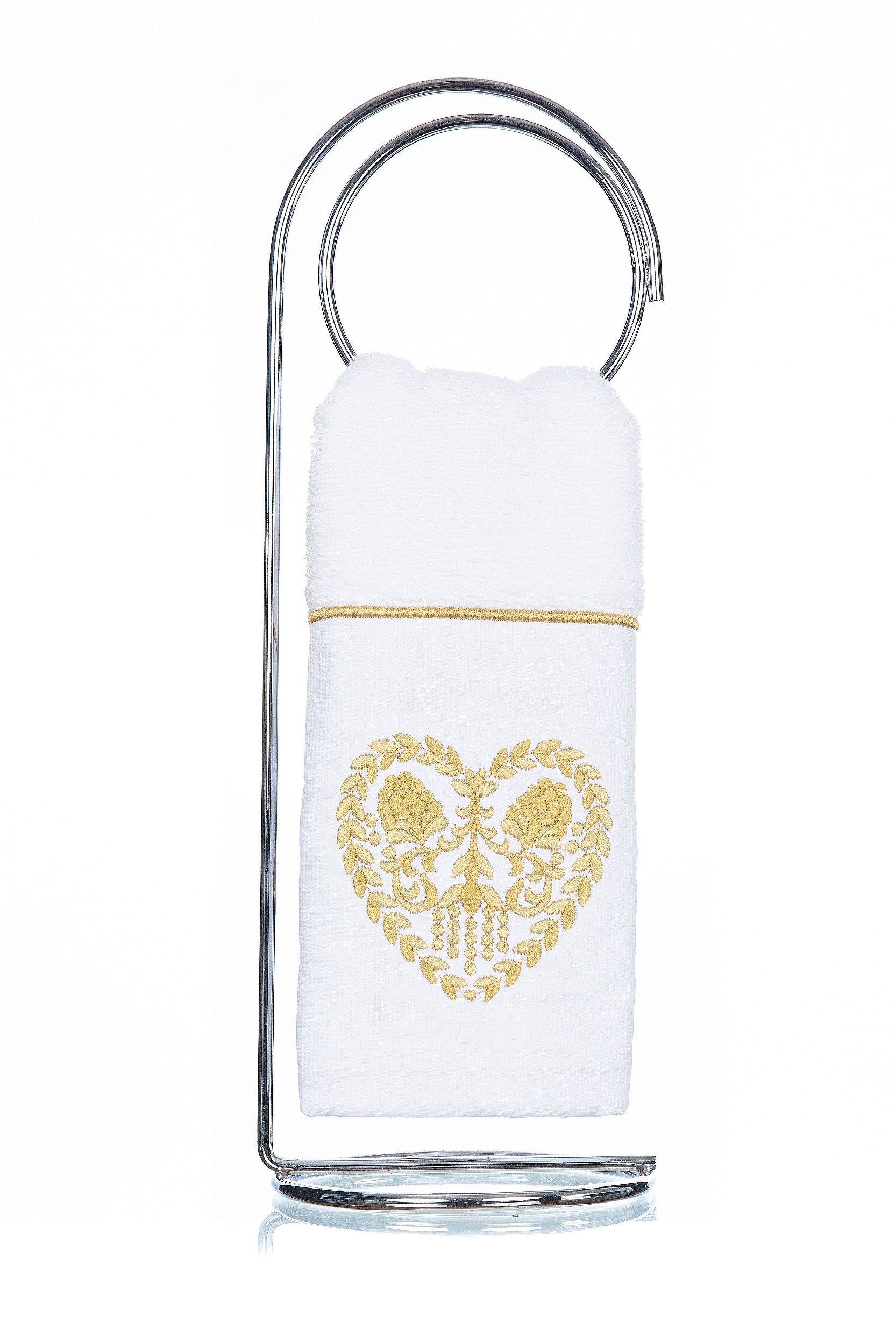 Nessa opção o bordado é feito diretamente no corpo da Toalha de Lavabo Donalice Decor linha Luxo Coração Dourado, finalizado com aplicação de uma delicada renda de guiper.