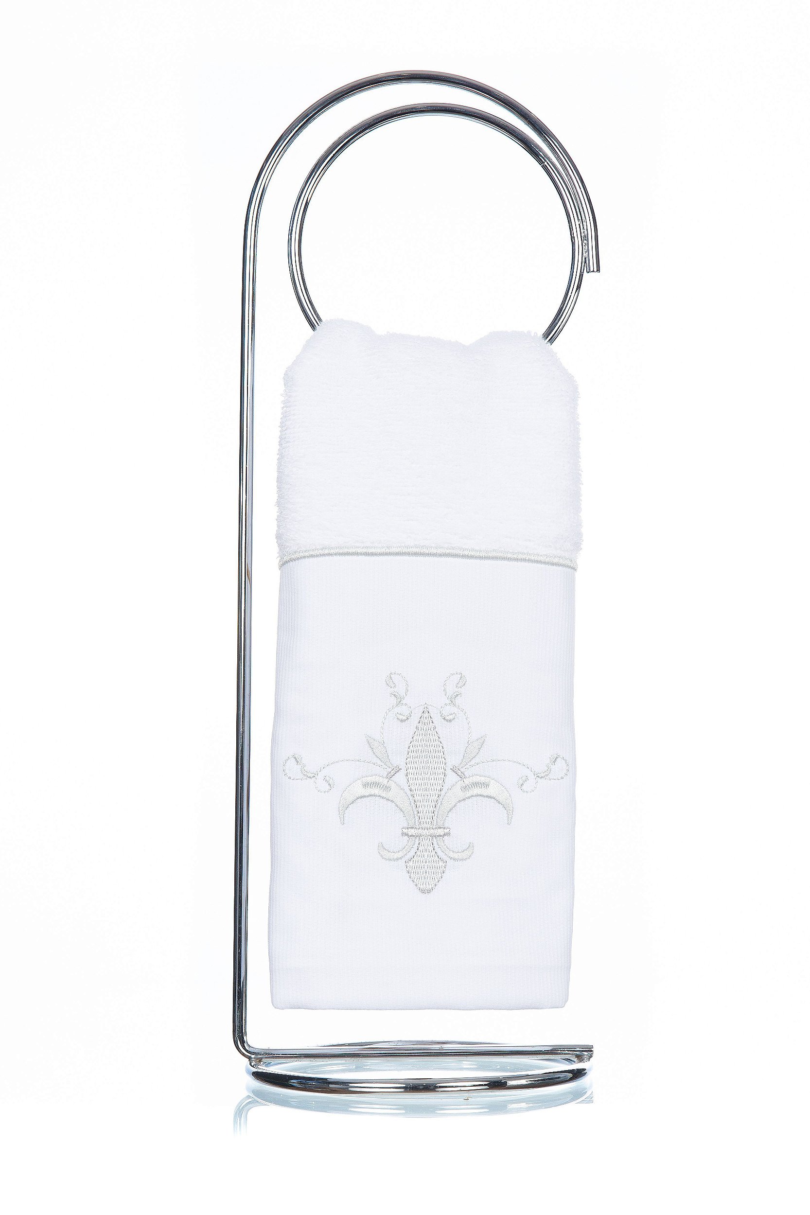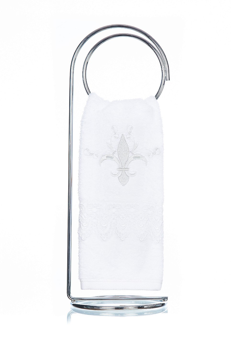 Nessa opção o bordado é feito diretamente no corpo da Toalha de Lavabo Donalice Decor linha Luxo Flor de Liz Prata, finalizado com aplicação de uma delicada renda de guiper.