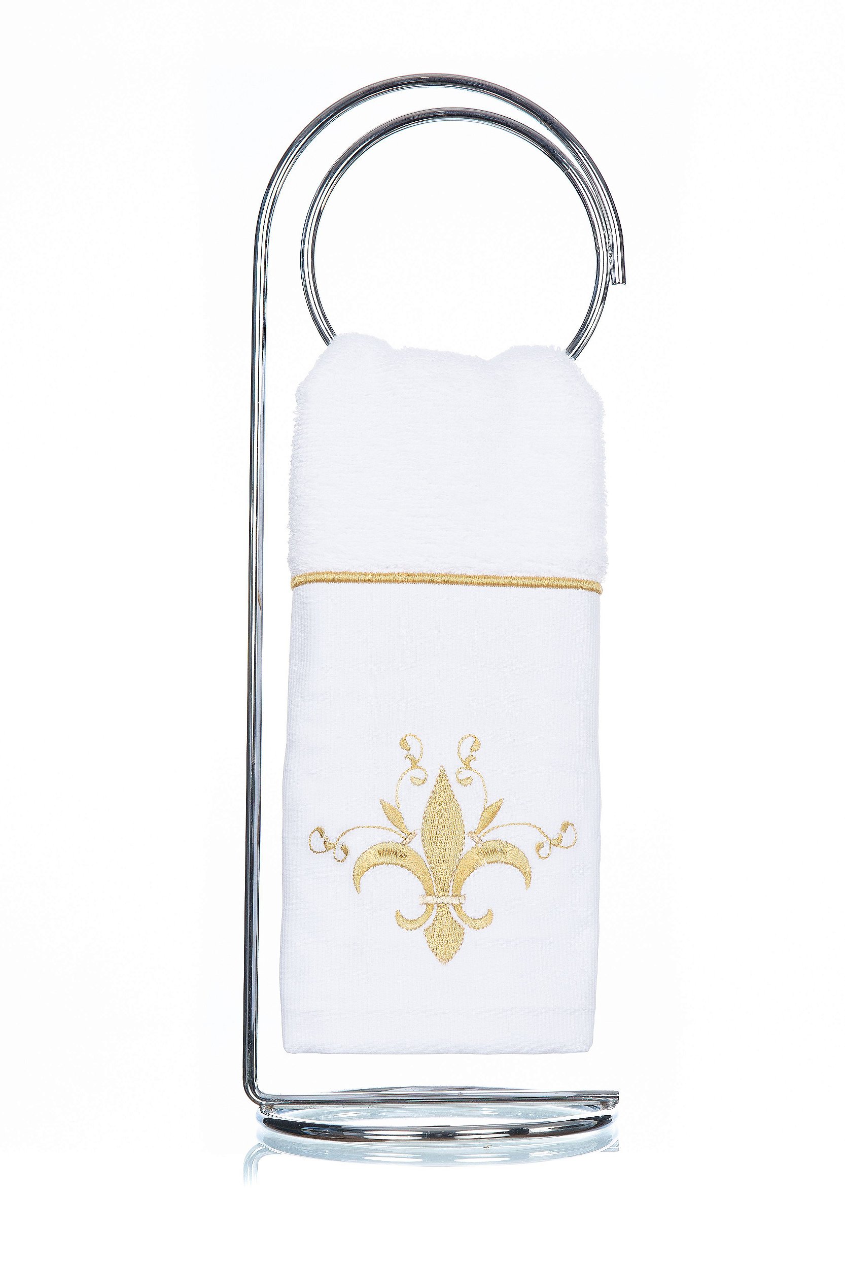 A Toalha de Lavabo Donalice Decor Linha Luxo Flor de Liz Dourada, possui acabamento com aplicação de bordado feito em tecido de fustão (100% algodão), e depois aplicado no corpo da toalha, finalizado com um delicado bordado em ponto royal.
