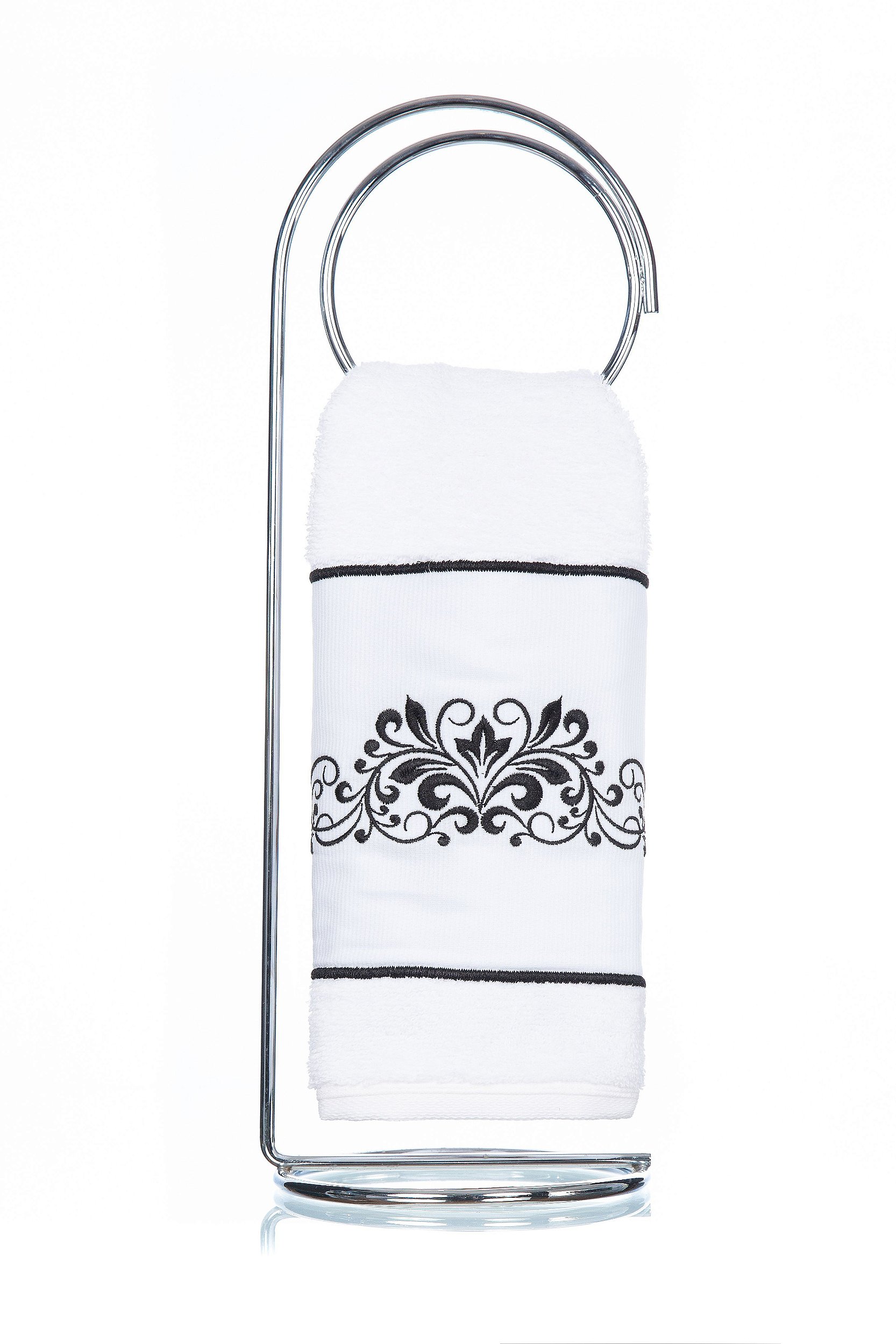 Nessa opção o bordado é feito diretamente no corpo da Toalha de Lavabo Donalice Decor linha Luxo Hero, finalizado com aplicação de uma delicada renda de guiper.