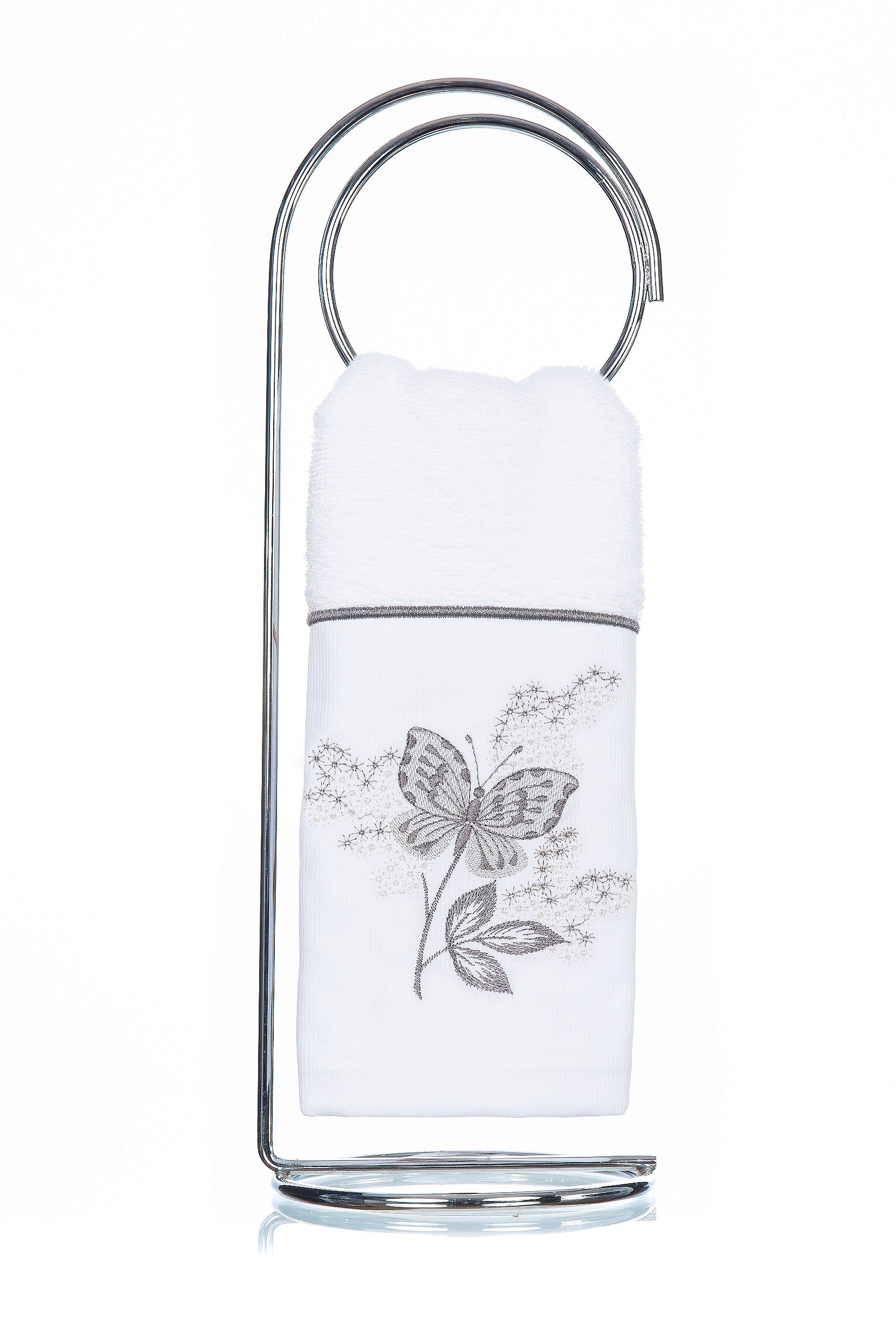 Nessa opção o bordado é feito diretamente no corpo da Toalha de Lavabo Donalice Decor linha Luxo Lani, finalizado com aplicação de uma delicada renda de guiper.